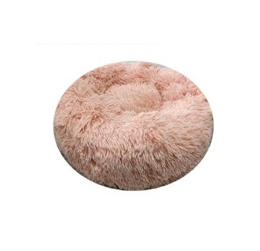 Cama redonda com pelo em tons de rosa para cão, com 80cm de diâmetro.