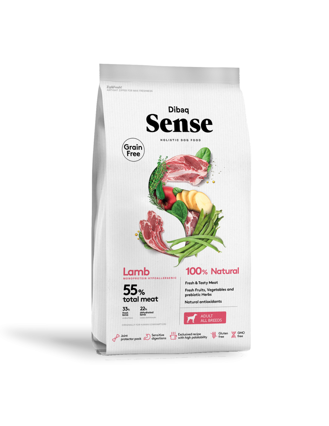 Dibaq Sense , alimento para cães adultos de todas as raças, monoproteico e 100% natural. Sem grãos, com carne fresca de cordeiro e uma seleção de frutas e vegetais frescos, garante alto valor nutritivo. Descubra a qualidade do Dibaq Sense , a melhor ração para cães.